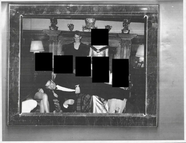 In one black-and-white image, Andrew can be seen lying across the lapse of five people whose faces have all been blacked out, while Maxwell stands behind them.